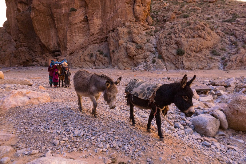 We turn on to a road that was used by trade caravans to cross the Anti Atlas from Tafilalet Valley to the Draa Valley, there where we see colours and contrasting landscapes in ochre, red, mauve and the black desert called Hamada. Around us are rocky plateaus where camels graze.